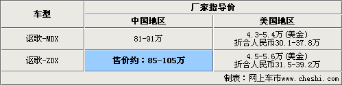 謳歌SUV車型MDX和謳歌跨界車ZDX同屬于一個級別的車型,它們的軸距都是2750mm。但是謳歌ZDX的車身要比MDX長,而身高度則低于MDX,這樣的設計完全符合跨界車(運動型多功能跑車)的定位。目前謳歌MDX在中國地區的售價為81-91萬,通過謳歌MDX在美國地區的售價,我們預計謳歌ZDX引入中國地區的售價約為85-105萬(謳歌ZDX目前美國地區的指導價為4.5-5.6萬美金,折合人民幣為31.5-39.2萬元)。