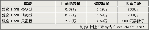 酷熊作為長城汽車在市場上推出的第三款轎車產(chǎn)品,憑借極具個性的造型和寬大的內(nèi)部空間,使很多消費者都對其非常感興趣。新車價格分別為豪華型6.39萬元、精英型6.79萬元,天窗版7.79萬元。近日,網(wǎng)上車市網(wǎng)站了解到,長城汽車4S店處的天窗版酷熊仍然處在無車銷售的狀態(tài),其他兩款車型有現(xiàn)車銷售,可以給出2千元的優(yōu)惠。具體詳情如下: