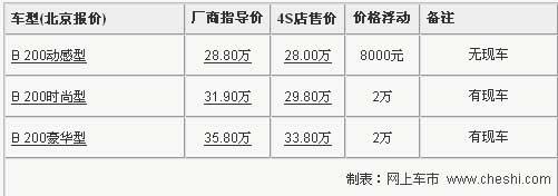 據北京奔馳4S店銷售人員介紹:目前奔馳B級分為B200動感型、B200時尚型和B200豪華版三款車型,B200豪華型為今年新推出車型,售價為35.8萬。其中時尚型和豪華型均可優惠2萬元,優惠幅度較大,現車也較充足,只是沒有配備真皮座椅和天窗的動感型一直沒有現車。