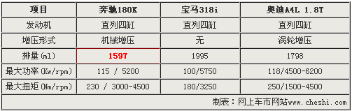 奔馳新C180K車型雖然僅搭載1.6升排量引擎,但其最大功率和扭矩卻高達115Kw/5200和230Nm/3000-4500,較排量為2.0升的寶馬318i分別高出15 Kw和50 Nm。由于奧迪A4L 1.8T搭載了1.8升燃油直噴渦輪增壓引擎,所以最大功率和扭矩位居三款入門級車型之首。