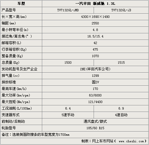 豐田改款新威馳依然由一汽生產(chǎn),同時將有6款車型推出,變速箱份為4速自動和5速手動。排量上分為1.3升與1.6升。長4300mm×寬1690mm×高1490mm的車身尺寸也與老款車型保持一致,完全可以滿足年輕人在日常中的使用,并且新款車型提供了防擦條選裝件,可增加個性與實用性。