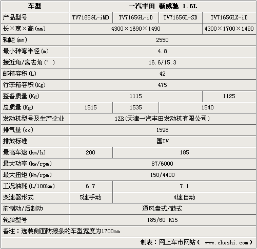 改款新威馳1.6升發(fā)動機是由天津一汽豐田生產(chǎn),與1.3升發(fā)動機生產(chǎn)廠有所區(qū)別。并且87Kw和150Nm的動力輸出也要更為強勁,1.6的手動車型最高時速可達200km/h,在同級車中可謂并不多見,足以應(yīng)付大部分路況,只是4速的自動變速箱看起來有些過時了。新威馳全系車型均配備了15寸輪轂,使該車更具時尚感。雖然剎車標(biāo)配的事前通風(fēng)盤、后鼓式制動器,但是對于這樣一款小車而言已經(jīng)夠用。