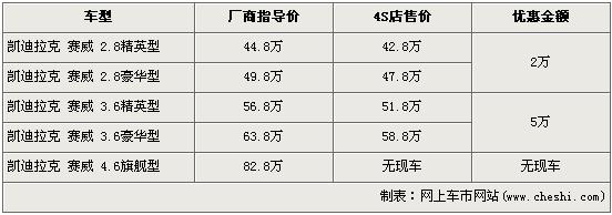 據4S店銷售人員介紹,目前凱迪拉克SLS賽威全系最高優惠5萬元。2.8L分為精英版和豪華版兩個車型,經2萬元優惠后售價分別降到了42.8萬元和47.8萬元。3.6L車型優惠5萬元達到了全系的最高,優惠后3.6精英版售價從56.8萬元下降到了51.8萬元,3.6豪華版售價也從63.8萬元下降到了58.8萬元。