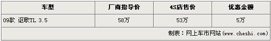據4S店銷售人員介紹,在售的只有09款謳歌TL 3.5一種車型,廠商指導價為58萬元。現在購買09款謳歌TL3.5的消費者可以享受到5萬元的現金優惠,經優惠后售價從58萬元下降到了53萬元。4S店內現車比較齊全,消費者有一定的挑選空間。