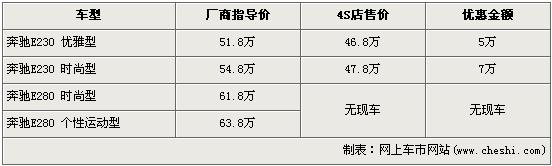 據4S店銷售人員介紹,奔馳E級現售的車型主要是E230和E280車型,其中E230時尚型的優惠幅度為7萬元,達到了全系的最高,優惠后售價從54.8萬元降到了47.8萬元。E230優雅型優惠5萬元,經優惠后售價從51.8萬元下降到了46.8萬元。銷售人員還介紹,E280全系店內均無現車,所以不在此次降價范圍內。