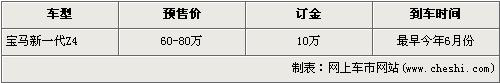 據北京寶馬經銷店銷售人員介紹,將引進國內的全新一代寶馬Z4分為sDrive30i和sDrive35i兩種車型,售價預計為60-80萬元。目前店內可以接受新Z4的預訂,訂金為10萬元。寶馬Z4 sDrive35i車型搭載了與寶馬X6 35i相同的3.0升雙渦輪直6引擎,最大功率達到了225Kw,最大扭矩達到了400Nm。現車方面銷售人員透露,最早的一批現車最快將會在6月份抵達北京寶馬經銷店,車型應該為sDrive30i,交訂金的消費者將會第一時間提到現車。