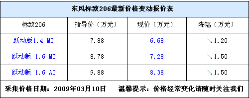 就在東風標致推出207車型的同時,標致206車型也隨之停產。近日,我們從北京地區的部分東風標致4S店處獲悉,現在標致206正在清理庫存,優惠較大,目前206僅有3款車型有現車,分別是躍動版1.4手動,躍動版1.6手動和自動,現車最高優惠1.5萬元元,售價分別為6.68萬,7.28萬和8.38萬元,現車比較充足,感興趣的朋友可以到店看車,價格還能有所降低。詳情請見下表。