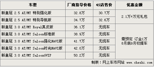 筆者從一汽豐田經(jīng)銷(xiāo)商處了解到,目前新皇冠的價(jià)格出現(xiàn)了較大的降幅,最高優(yōu)惠達(dá)到2.1萬(wàn)元,同時(shí)在7月31日之前購(gòu)車(chē)的客戶贈(zèng)送萬(wàn)元的禮包,包括了三種不同的禮包。目前皇冠2.5L兩款車(chē)型有黑色、白色現(xiàn)車(chē)供應(yīng),而3.0排量基本沒(méi)有現(xiàn)車(chē),據(jù)銷(xiāo)售人員介紹,目前主要以2.5L銷(xiāo)售為主。如果訂車(chē)的話,需訂金1萬(wàn)元,8月底9月初能夠提到現(xiàn)車(chē)。