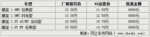 據(jù)4S店銷售人員介紹,此次酷寶系列車型涉及系列內(nèi)各款車型,1.8L手動時尚型及1.8T自動版運動型車型的現(xiàn)車各店最高可給出8000元的現(xiàn)金優(yōu)惠。而1.8T系列車型部分顏色需要訂購,優(yōu)惠幅度同樣可達到8000元;操控效果極佳的酷寶車型現(xiàn)車各店內(nèi)并不是非常充足,享受優(yōu)惠的同時仍需由經(jīng)銷商處進行預訂購買。購車時商家還另外提供高檔裝飾贈送,但不能折換現(xiàn)金。