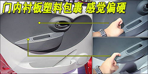天津一汽威姿V1門內襯板由塑料包裹,手觸感覺整體偏硬,胳膊長時間放置會感覺勞累。