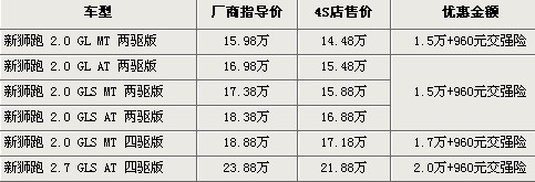 據(jù)4S店銷售人員介紹,目前購買獅跑可以贈送960元的交強險,同時有1.5萬-2萬元不等的現(xiàn)金優(yōu)惠。兩驅標準版優(yōu)惠后售價僅為14.48萬元。目前經(jīng)銷商處有黑色、銀色等現(xiàn)車供應,藍色等款需要預定,訂金為2千元,月內便可以順利提車。