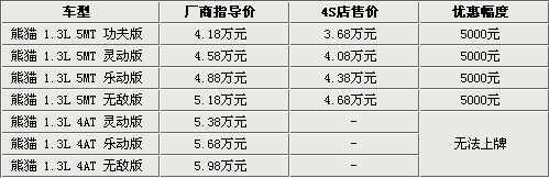 據吉利汽車4S店銷售人員介紹,熊貓1.3L手動擋車型目前都有現車銷售,而自動擋雖然已經上市,但由于北京地區無法上牌,所以還沒有現車抵達北京市場,預計最早會在今年8月份解決無法上牌的問題。目前熊貓1.3L手動擋全系可以優惠五千元,而這款車型還增加了電動升級后窗,需要在原價的基礎上加1000元。