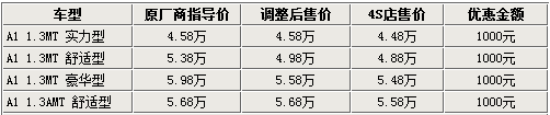 上個月中旬,奇瑞09款A1宣布在現有車型的基礎上增加了實力型和AMT兩種新車型,同時舒適型和豪華型官方降價4000元,售價已進入五萬元以內。網站近日了解到,各家4S店內的新車價格有所變化,全系車型均可小幅優惠1000元。詳情如下: