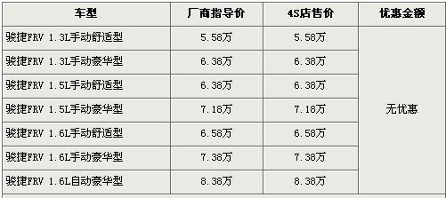 駿捷FRV是中華汽車首款兩廂車型,排量分為1.6L和1.3L,兩種排量車型分別在去年5月份和7月份上市。近期,駿捷FRV的車型再次得到了豐富,1.5L車型已經(jīng)進(jìn)入各家中華經(jīng)銷店并開始售賣,駿捷FRV全系的售價(jià)區(qū)間為5.58萬元-8.38萬元。根據(jù)我們價(jià)格系統(tǒng)監(jiān)測顯示,駿捷FRV全系取消了現(xiàn)金優(yōu)惠,具體詳情請看下表: