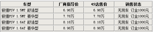 經銷商透露,現在各店內的FSV基本為展車或已被客戶預訂的車輛,基本沒有現車可以滿足消費者的需要,消費者如需購買可以繳納1千元訂金后等待一個月左右即可提車。由于駿捷FSV為剛剛上市的新車,所以店內沒有任何形式的優惠,請消費者諒解。