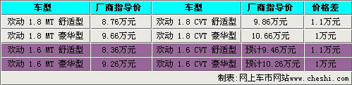 海馬歡動1.6L共有三款車型,其中基本型由于配置低,市場上并沒有銷售,而海馬也不會為這樣一款低配車型匹配CVT變速箱,所以,歡動1.6L CVT可能只有舒適型和豪華型兩款車。從歡動1.8L的手動擋和自動擋的差價可以看到,舒適型相差1.1萬元,而豪華型也相差1萬元。依照海馬歡動的定價規則,歡動1.6L CVT舒適型和豪華型的價格預計為9.46萬元和10.26萬元。