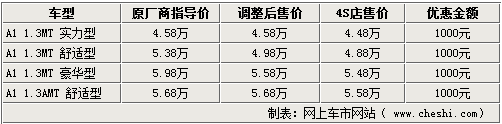據(jù)奇瑞汽車4S店銷售人員介紹,奇瑞09款A1目前只有舒適型有現(xiàn)車銷售,原廠商指導價為5.38萬元,官方降價后為4.98萬元。A1 1.3L豪華型和新增加的實力型和自動擋目前都沒有現(xiàn)車,預訂需要等1-2周才能提到現(xiàn)車。目前購買奇瑞A1全系車型,都可以贈送一款價值3000元的GPS導航儀一部。