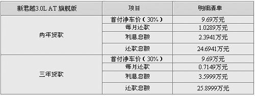 貸款詳解:新君越新上市不久,目前仍需要加價提車,現在實行的分期付款購車,分為兩年及三年付款兩類,買車的朋友可以根據自己的實際能力選擇貸款項目。首付款為凈車價的三成,也就是在9.69萬,當然編者所列的車型是新君越的最高配,按照比例來計算的話其它版本的車型首付款要低于9.69萬。