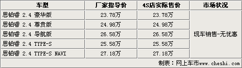 據(jù)東風(fēng)本田4S店銷售人員介紹,目前思鉑睿全系車型均以到店,但車型顏色比較單一。思鉑睿全系提供了塔夫綢白、彩晶黑、鈦金銀、炫影藍(lán)、炫動(dòng)紫五種外觀顏色,以及靜雅黃、靜逸黑兩種內(nèi)飾顏色供消費(fèi)者選擇。TYPE-S車型還推出炫速紅專用色。售后保養(yǎng)方面制定整車三年十萬(wàn)公里的保修政策,提供3個(gè)月/5000公里的易損件保修服務(wù)。