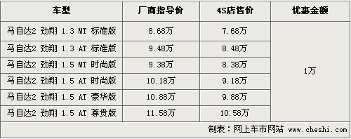 據4S店銷售人員介紹,三廂優惠幅度為1萬元,據銷售人員介紹,選購馬2的消費者多數選擇2廂車,而三廂在性價比上更超值。目前豪華版和時尚版有現車供應,入門車型優惠后僅為7.68萬。
