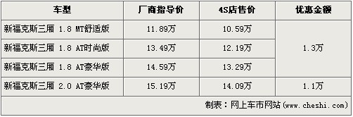 據4S店銷售人員介紹:目前福克斯三廂1.8升車型有1.3萬元的優惠,經優惠后三款1.8L車型售價分別降為了10.59萬元、12.19萬元和13.29萬元。2.0L車型有1.1萬元的優惠,優惠后售價降到了14.09萬元。