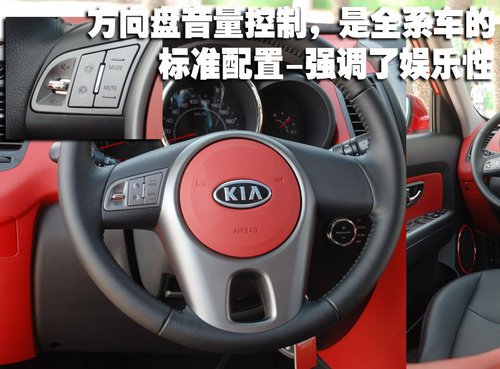 SOUL全系車型的方向盤上方都帶有一個音響控制按鈕,通過這個區域可以控制收音機、CD、MP3以及各個音樂模式之間的切換。強調娛樂性絕對是SOUL設計中最大的一個亮點。不過方向盤本身的造型還是比較普通,和剛剛上市的起亞福瑞迪很是相像。