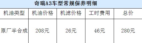 或許有人會想,采用自主研發發動機的奇瑞A3車型的保養費用上應該比較便宜吧!其實不然,由于奇瑞4S店為奇瑞A3車型標配的是美孚速霸1000半合成機油,因此材料費比較高,計算下來更換機油機濾總共需要花280元左右。而奇瑞A3享受兩次的免費保養檢測,第一次為2000公里時的免費檢測以及油液補充,第二次是5000公里的機油機濾的更換。
