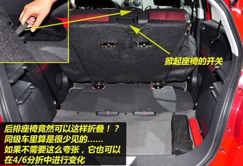 除此之外丘比特的后排座椅變換方式也比較多樣,在車主需要擴(kuò)展后備廂空間時(shí),首先可以按比例放倒后排椅背,如果還嫌不夠可將整個(gè)后排座椅掀起,此時(shí)空間進(jìn)一步增大而且地板是完全水平的,兩種變換方式可以應(yīng)對(duì)不同的使用情況,較高的靈活程度增加了后備廂的實(shí)用性。