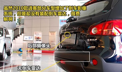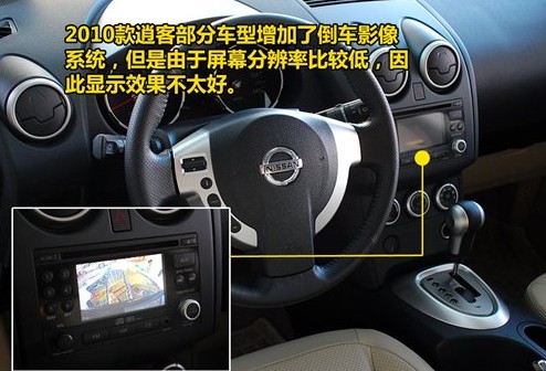 新的逍客在外觀上沒有任何變化,僅僅只在原來6款車身顏色的基礎上增加夢幻銀色。更多的變化出現在車輛內部的配置上,部分車型增配了倒車影像系統,但我們卻認為這個并不實用,因為屏幕只有4.3英寸,也就是和一般車載導航儀的大小相當,而且分辨率比較低,所以顯示效果不好。令人費解的還有,有了攝像頭之后,逍客卻沒有裝配倒車雷達,其實大家在倒車的時候,倒車影像只是作為參考,主要還是依靠倒車雷達的聲音來判斷距離遠近,所以沒有倒車雷達很不方便。
