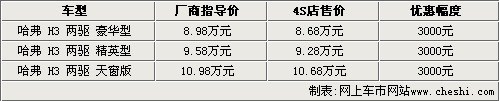 據長城汽車4S店銷售人員介紹,長城哈弗H3的現車都比較齊全,并且出現了一定的優惠幅度。但相比前幾個月,優惠幅度卻有所減少,目前購買哈弗H3都可以優惠3000元。另外銷售人員表示,長城哈弗H3的廠商指導價只是白色普通漆車型,金屬漆其他顏色車型需要加價2000元。