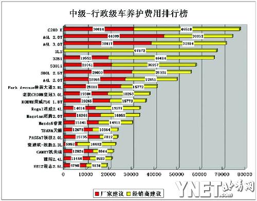 軸距在2700mm至2850mm的為中級車,超過2850mm的為行政級車。排行榜中的二十款中級、行政車養護費用顯示:日系品牌車型的保養價格較低。豪華品牌的車主不僅有權利享受到各種專屬服務。它們的愛車也得到更好的維護——喝的是純合成機油,用的是白金的火花塞……