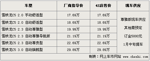 據(jù)東風(fēng)雪鐵龍4S店經(jīng)銷人員介紹,目前東風(fēng)雪鐵龍C5現(xiàn)車供應(yīng)也比較緊張,只有自動尊雅版有少量黑色現(xiàn)車供應(yīng),其他款均需要預(yù)訂,訂金為5000元,預(yù)計1月中旬可以提車。