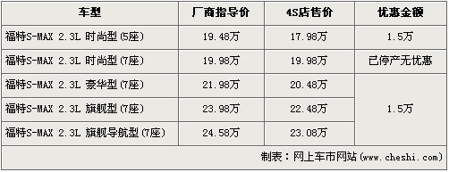 據北京福特4S店銷售人員介紹,店內在售的福特S-MAX有1.5萬元的現金優惠,并且7座的時尚版車型已經停產。經1.5萬元優惠后,2.3L豪華版、旗艦版、旗艦導航版的售價分別降為了20.48萬元、22.48萬元和23.08萬元,入門級的5座時尚型售價降到了17.98萬元。