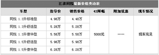 江淮同悅有1.3L和1.5L兩種排量,全為手動(dòng)檔車型。分標(biāo)準(zhǔn)型、舒適型和豪華型三種配置。標(biāo)準(zhǔn)型無(wú)安全氣囊,配備有ABS制動(dòng)防抱死系統(tǒng),四門(mén)車窗和電調(diào)后視鏡;舒適型增添了駕駛座安全氣囊、倒車?yán)走_(dá)、遙控鑰匙和中控;豪華型相對(duì)于舒適型升級(jí)了副駕安全氣囊和前霧燈安全配置,配備了單碟CD機(jī)并升級(jí)了音響系統(tǒng),增加了后視鏡加熱功能和鋁合金輪轂。