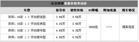 長安奔奔1.0標準版標配同色后視鏡、同色防擦條、外接音源接口、前后霧燈和手動空調等基礎配置;1.3手動舒適版在此基礎上增加了駕駛室安全氣囊和中空鑰匙等配置;經典版在舒適版基礎上增加了副駕駛座安全氣囊、遙控鑰匙、鋁合金輪轂以及遮陽板化妝鏡等裝置;豪華版在經典版基礎上增加了單碟CD和前后電動車窗等配置;超值版在豪華版基礎上增加了ABS/EBD以及發動機電子防盜系統。