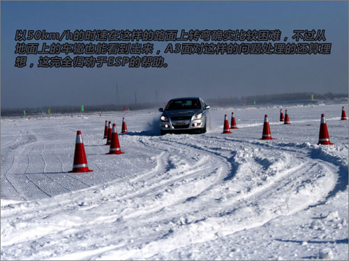 在雪地上行駛,過于光滑的路面是最大的安全隱患,幾乎為零的摩擦力使得四個輪子幾乎抓不住地面。在專業教練的陪同下,我們首先在開啟ESP功能的情況下的行駛中躲避障礙物的體驗。以預定車速進入車道后將車輛加速至50-60km/h,向左躲避面前的一個裝桶,第一個緊急變線時,(將方向盤的向左的轉向角度故意打的比常態更大一些,目的是為了讓車底的轉向傳感器有更明顯的認知,從而引導ESP更好的工作。)在車內可以比較明顯的感覺到ESP為了糾正車輛即將出現的轉向不足的問題給車輛的左后輪施加了制動力,從而使車輛比較順利的換到了旁邊的車道內。在這之后趕緊回正方向,ESP為了糾正車輛有可能出現的轉向過度的問題又給左前輪施加了制動力,從而使得車輛平穩的留在了障礙物左側的車道內。