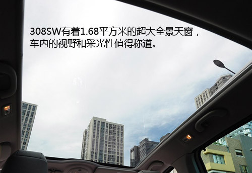 標致308SW作為一款進口小眾車型,可能并沒有太多人熟悉。作為一款休旅款車型,308SW有著1.68平方米的超大全景天窗。說是天窗或許不夠形象,說它是玻璃車頂則很貼切。這個覆蓋了幾乎三分之二車頂的天窗雖不能開啟,但加上前風擋玻璃和寬大的側窗及尾窗,占到了車身總面積的1/3,車內的視野和采光性值得稱道。