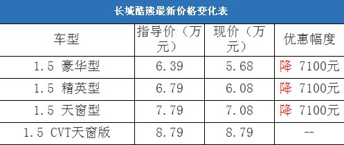 近日,編輯從長城汽車4S經銷商處了解到,酷熊前段時間購車送鉆石的促銷活動已經結束,目前在店內購車沒有任何優惠。相比之下,在綜合經銷商處購車的消費者可以享受7100元的現金優惠。據經銷商透露,酷熊的CVT版車型也可以預定,定金為2000元,等待15個工作日就可以提車,但是購車沒有任何優惠。以下是長城酷熊最新價格變化表: