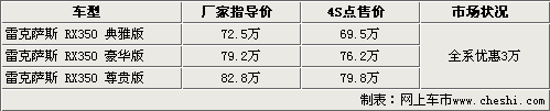 據(jù)北京雷克薩斯4S店銷(xiāo)售人員透露,目前初低配版本的RX350典雅版車(chē)型的貨源相對(duì)比較緊張,其余兩款車(chē)型的貨源充足,只是個(gè)別顏色需要預(yù)定,訂貨周期在10個(gè)工作日左右。現(xiàn)在購(gòu)車(chē)在可以得到3萬(wàn)元的現(xiàn)金優(yōu)惠還,還可以得到商家贈(zèng)送的簡(jiǎn)單裝飾。