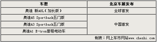 奧迪新一代A8車型雖然已于去年底正式發布,但其為中國消費者量身訂做的加長版-新A8L將在國人面前全球首發。奧迪A5 Sportback五門版、奧迪A3 Sportback五門版車型,將于今年正式以進口身份引入國內。而奧迪A1 E-tron曾程電動車作為一款節能減排的概念車,將向人們展示其獨特的性能和環保技術。
