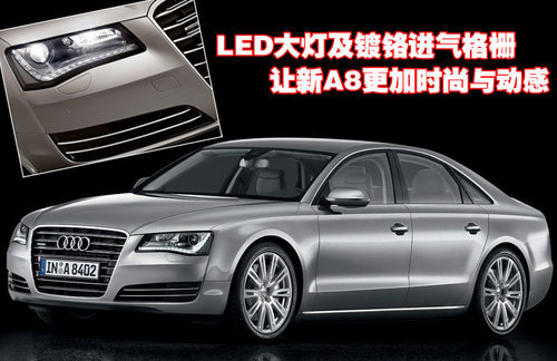 從奧迪新A8車型的前臉可以看出,LED自適應前大燈、圓形前霧燈、獨立牌照支架以及鍍鉻進氣格柵等升級讓其更加時尚與動感。