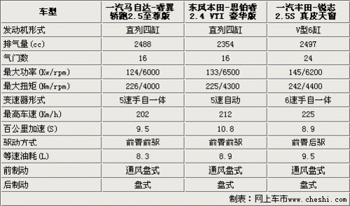 通過以上橫向對比,可以看出睿翼轎跑、思鉑睿和銳志的排量都在2.4這個區間,并且都具備了日系發動機傳統的特點:性能良好、油耗經濟,但是發動機形式卻完全不同。從官方公布的等速油耗來看,睿翼轎跑的油耗要低于本田思鉑睿和豐田銳志,這與一汽馬自達強調的輕量化設計車身是分不開的。銳志采用了V型6缸發動機,該發動機運用了雙VVT-I技術,因此在動力方面明顯要優越于睿翼轎跑和思鉑睿,同時再加上銳志為后驅車型,再加上百公里加速僅為8.9秒,就從這兩點就也可以看出銳志是一款偏運動的車型。在變速器方面,銳志略勝一籌,配備了手自一體式6速自動變速箱,思鉑睿則是5速自動變速器,是三款車型中配置較低的。三款車型的制動系統都是前通風盤后實心盤。