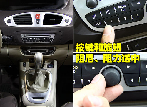 雷諾新風景的中控臺面板屬于時尚、簡潔的類型。中控臺的各按鍵、旋鈕在使用中各項調節功均能準確到位,音響控制面板按鍵大小適中,方便乘客操作。