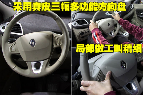 雷諾新風景的方向盤左右兩側控制桿為塑料材質包裹,手觸感覺十分的細膩,無論是看、觸都能感覺到這部分材料的制作工藝和整體質量都很出色,值得一提的是這款車的旋鈕設計能夠滿足手指粗大駕駛者的使用及調節。
