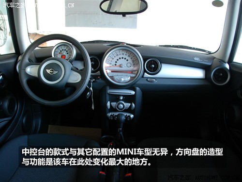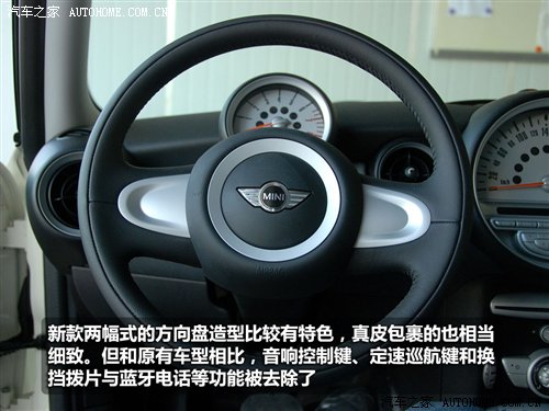 此外,兩輻式的方向盤造型改變對于熟悉MINI的人來說就需要時間去適應了,造型的改變和價格沒什么直接的關系,關鍵在于多功能按鍵也隨之消失了,原來的音響調節、定速巡航和車載電話功能都不再能看到?吹竭@里你可別不高興,要知道這些都有裝備的車型就不是這個價了,要30萬以上才行。
