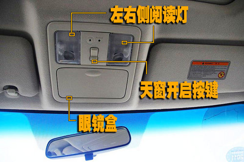 東風日產新軒逸兩側遮陽板之間為駕駛席和副駕駛席分別提供了獨立式的閱讀燈,方便車主與乘員在夜間查看地圖等。閱讀燈前側配有眼鏡盒。