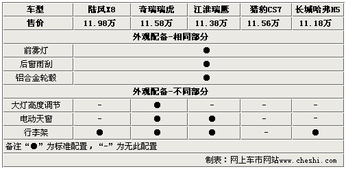 外觀方面,五款車(chē)均配備了獨(dú)立設(shè)計(jì)的前霧燈、后窗雨刷和鋁合金輪轂。而奇瑞瑞虎還配備了大燈高度調(diào)節(jié)功能,其他車(chē)型并未裝備。瑞虎、瑞鷹還為大家配備了更貼近家庭使用的電動(dòng)天窗,雖然天窗的實(shí)際使用率并不高,但是偶爾使用也是很愜意的。除了獵豹CS7,其余4款車(chē)都配備了車(chē)型行李架,為出行載物提供了不少的便利。