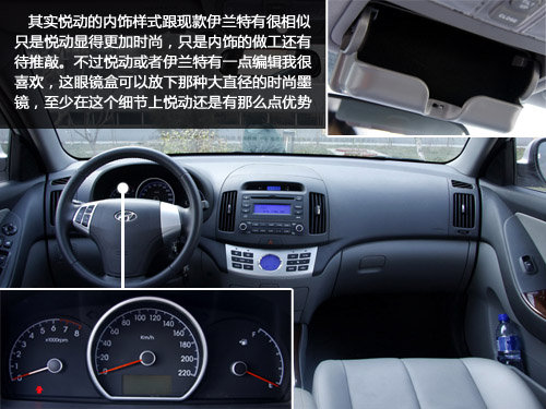 悅動的內飾設計主要以簡潔為主,并輔助以時尚實用,雖然桃木的配飾依然感覺塑料感十足,但是顏色的搭配讓它桃木俗套的感覺減弱不少,值得一提的是它的眼鏡盒設計,頭頂前方的位置會更加方便行駛中放置眼鏡,并且眼鏡盒空間比較大,一般的大個墨鏡放進去不會有任何阻礙。