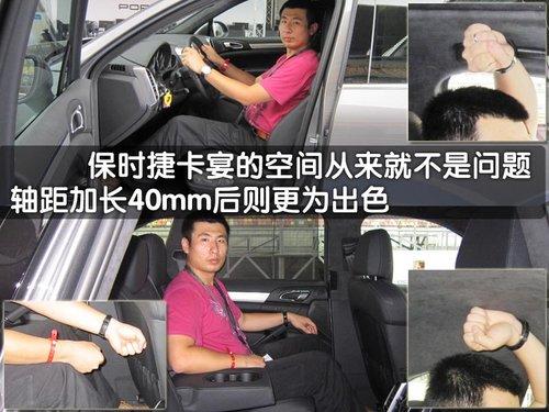 對于卡宴車型來說其內部空間向來都是它的優勢,上圖中的駕駛者身高1.76米在他的正常駕駛坐姿下駕駛席的頭部空間在一拳以上,后排的腿部空間在兩拳以上、后排同步空間略微小于前排的頭部空間。