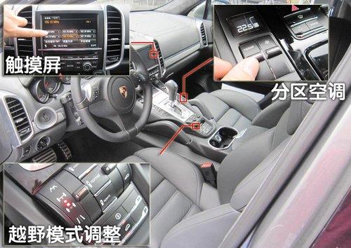 圍繞在中控臺周圍,高清晰觸摸式中央顯示器用來實現車輛設置、導航以及娛樂(包含選裝的電視)功能。在變速器的后方為車輛懸架高低調節以及四驅模式調節的按鈕,變速器的兩邊則為空調部分系統的控制按鈕,整體上來說新卡宴的各種功能布局與老款車型沒有太多差別。